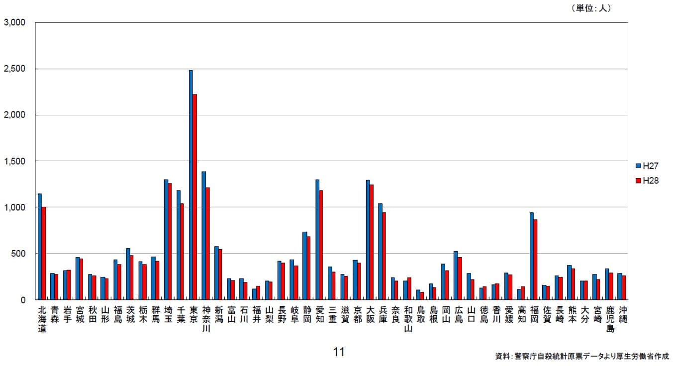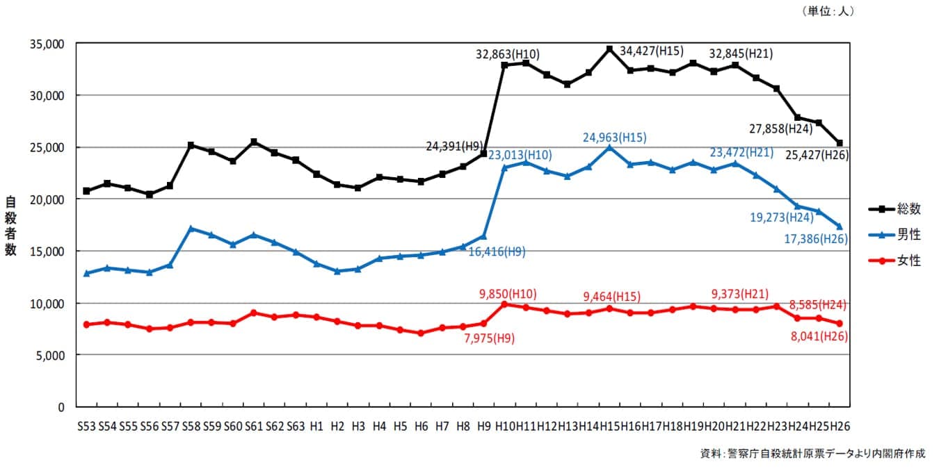 ○平成26年の自殺者数は25,427人となり、対前年比1,856人(約6.8%)減。平成10年以来、14年連続して3万人を超える状況が続いていたが、3年連続で3万人を下回った。